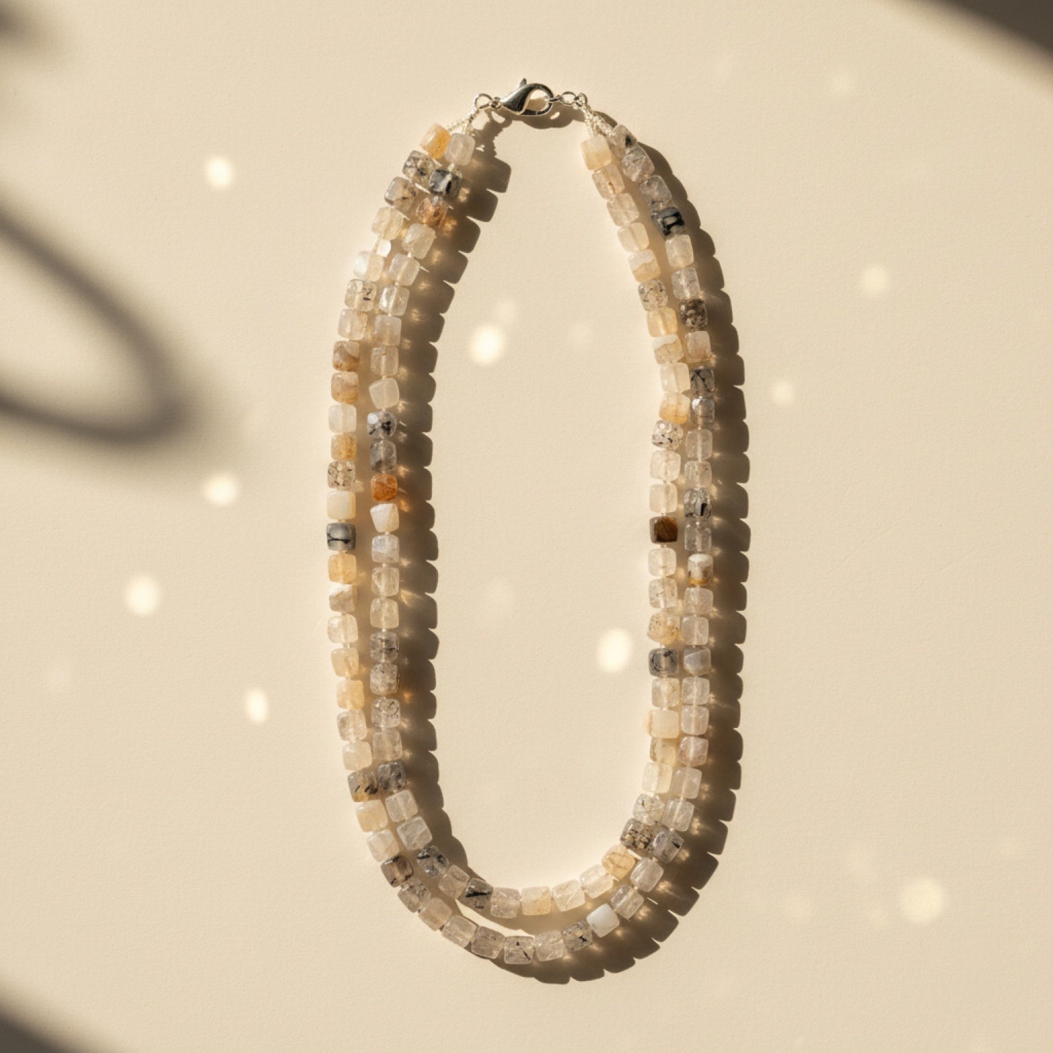Arctic Cube Drape is quiet luxury in gemstone form. Two strands of hand-strung faceted cube-cut white agate beads sit gently against the collarbone, catching light through their translucent surfaces. Each bead shifts between icy white, soft cream, warm peach, and the occasional smoky grey — a natural colour palette that pairs with everything. The geometric cube cut gives the piece a clean, modern edge while the organic stone variation keeps it feeling handmade and one-of-a-kind.