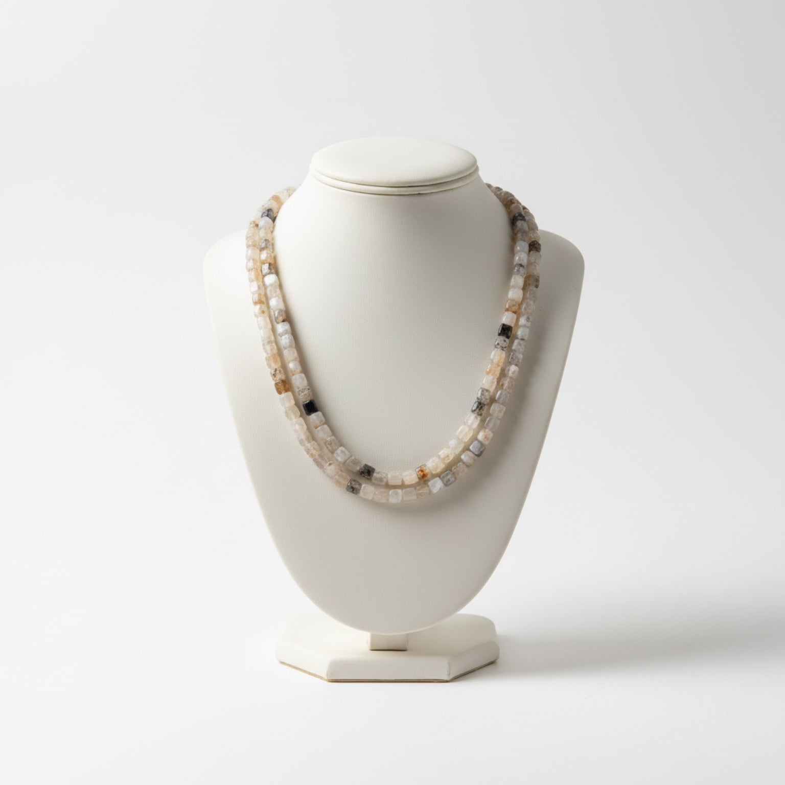 Handcrafted double-strand white agate necklace with faceted cube-cut beads. Soft translucent tones of white, cream, and peach. Lightweight, minimal, and made to layer.