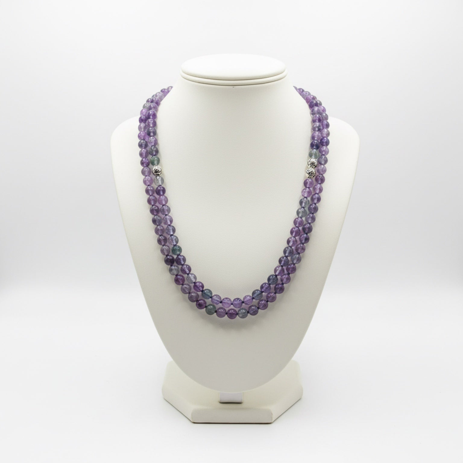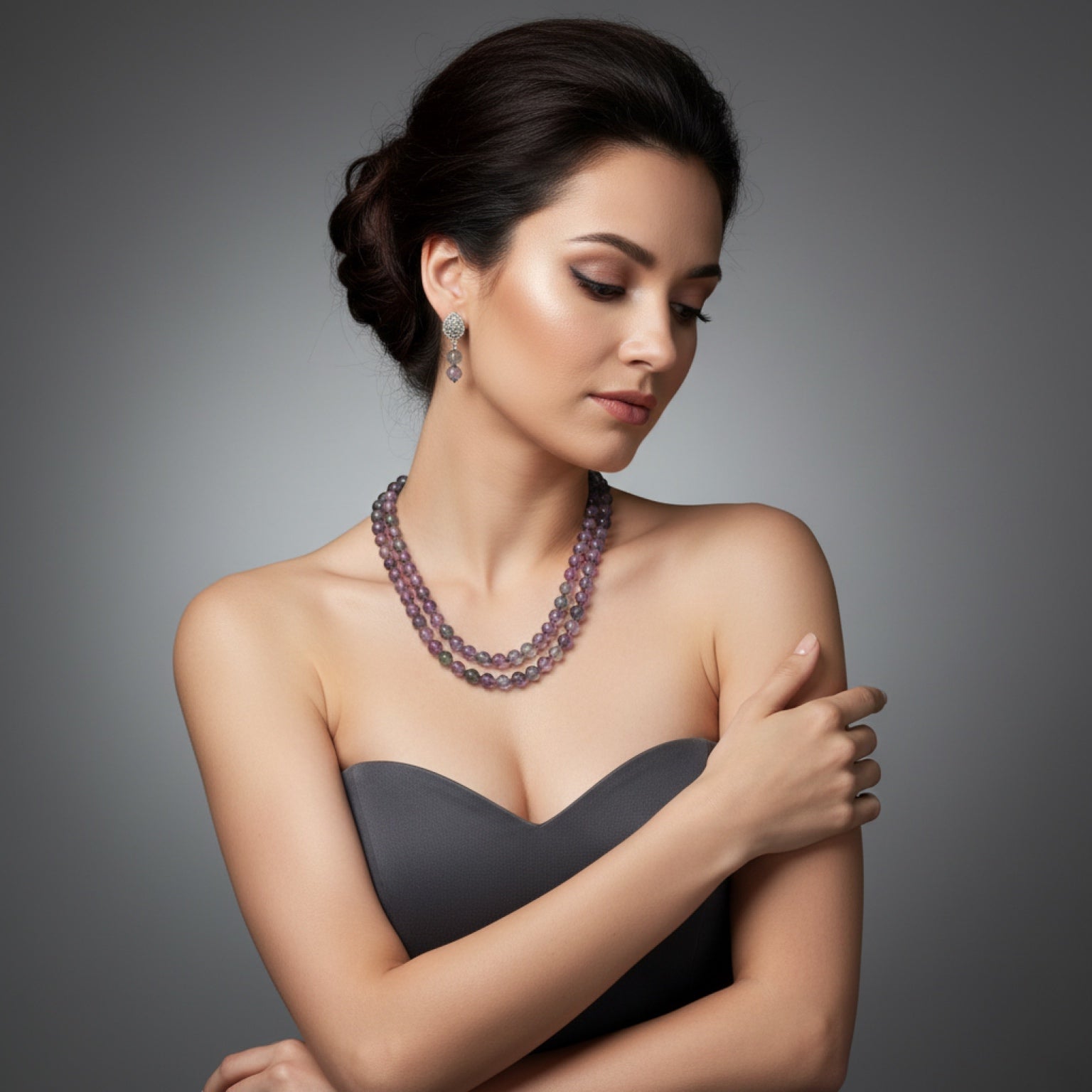 Purple Aura Layers commands attention with its rich, jewel-toned depth. Two strands of translucent round agate beads cascade across the neckline, flowing between deep violet, soft lavender, and flashes of cool teal-green — a natural colour palette that feels almost gemstone royalty. Ornate silver-toned filigree accent beads are placed at the shoulders, adding a touch of refined detail that bridges the two strands. The translucent quality of each bead lets light pass through, creating a glowing, almost celestial warmth against the skin. Paired with matching agate drop earrings, this set carries a confident, mystical energy that elevates any outfit.