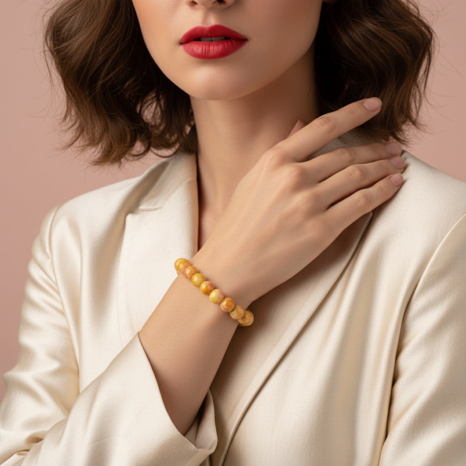 Aure showcases golden-yellow agate beads with soft tonal variation. The polished surface enhances its warm, clean aesthetic.