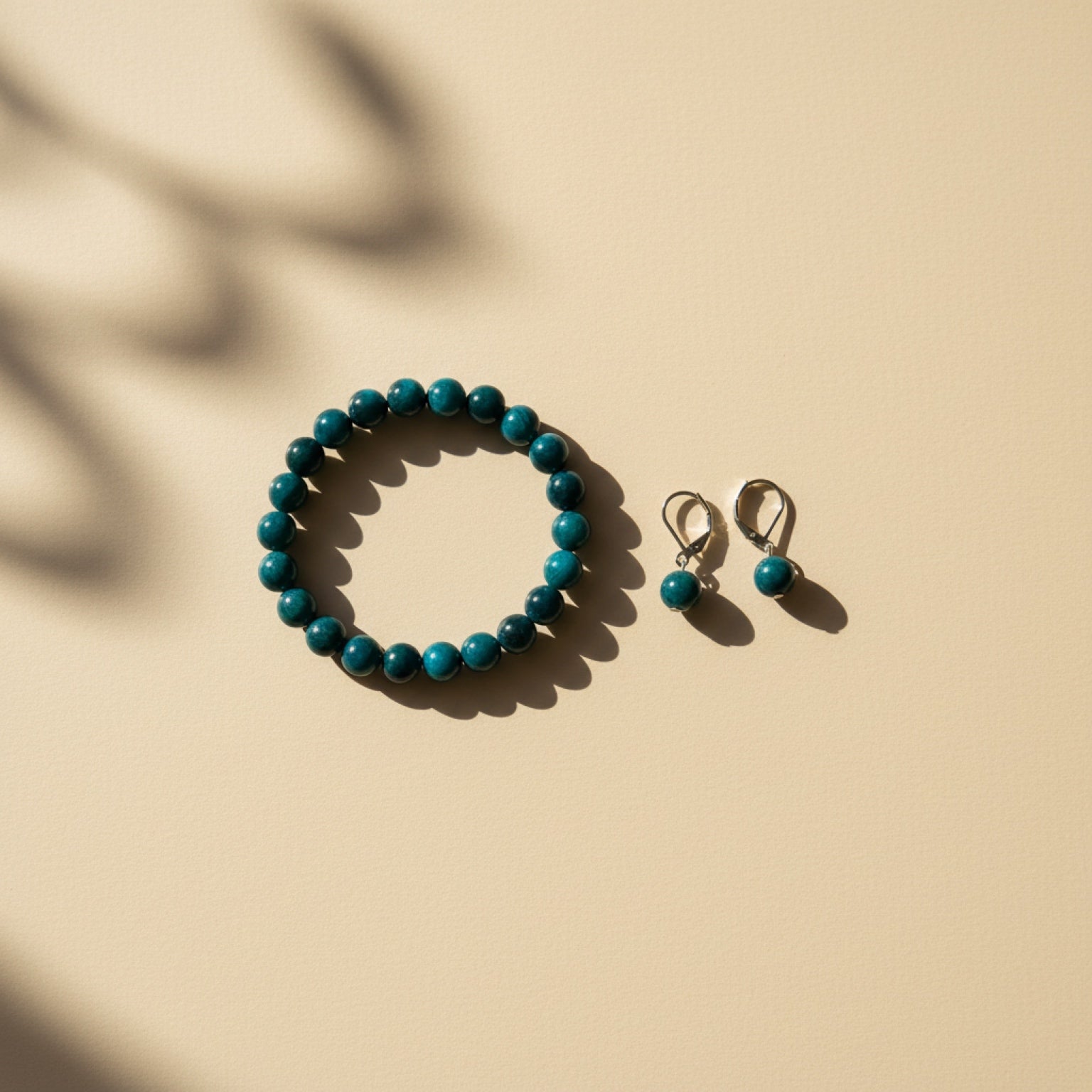 Azura Set pairs a polished agate bracelet with matching earrings, creating a coordinated and refined look. The deep teal tones and clean finish make it a versatile set for both casual and styled wear.