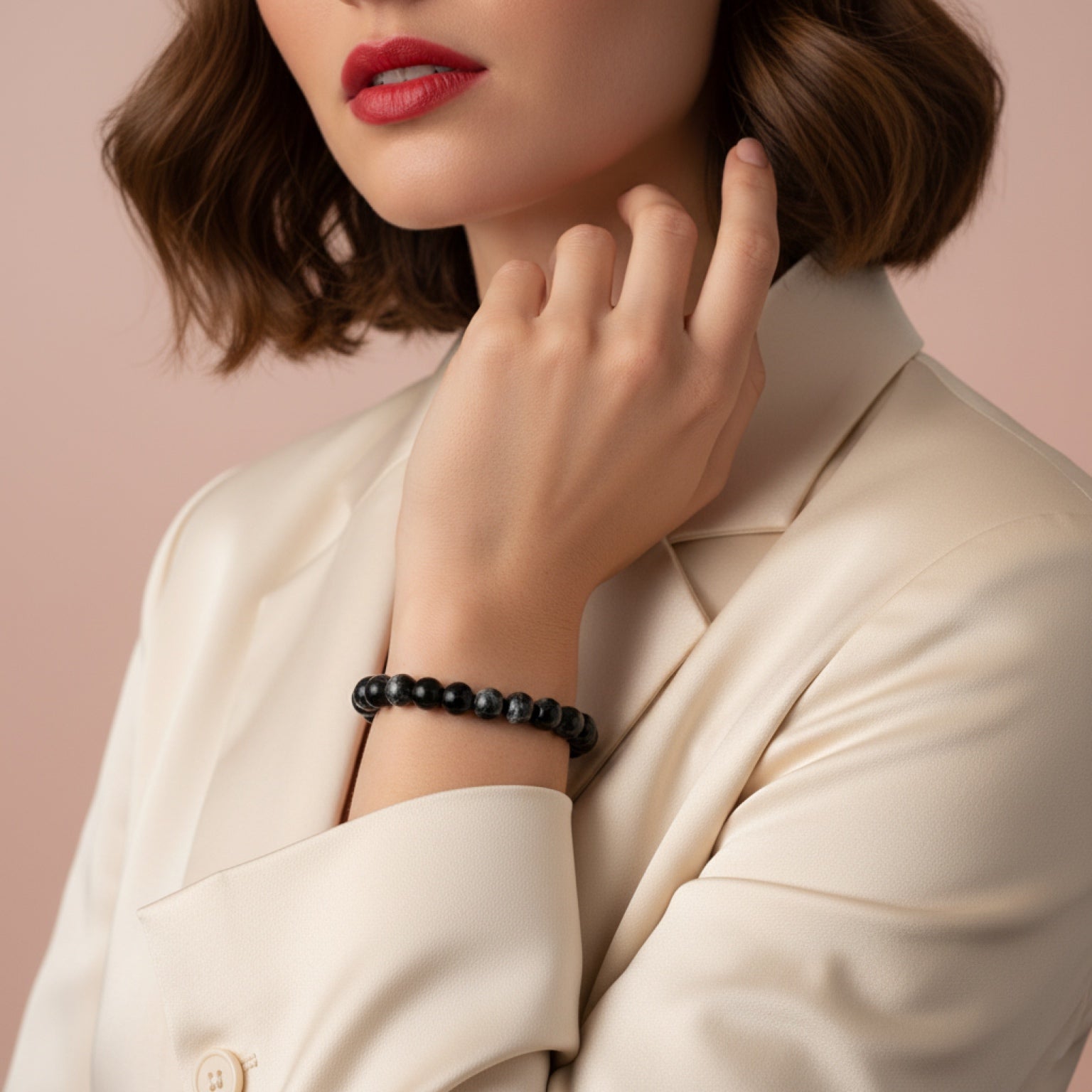 Noire features polished black agate beads with a smooth and consistent tone. Its simplicity creates a timeless and versatile bracelet.