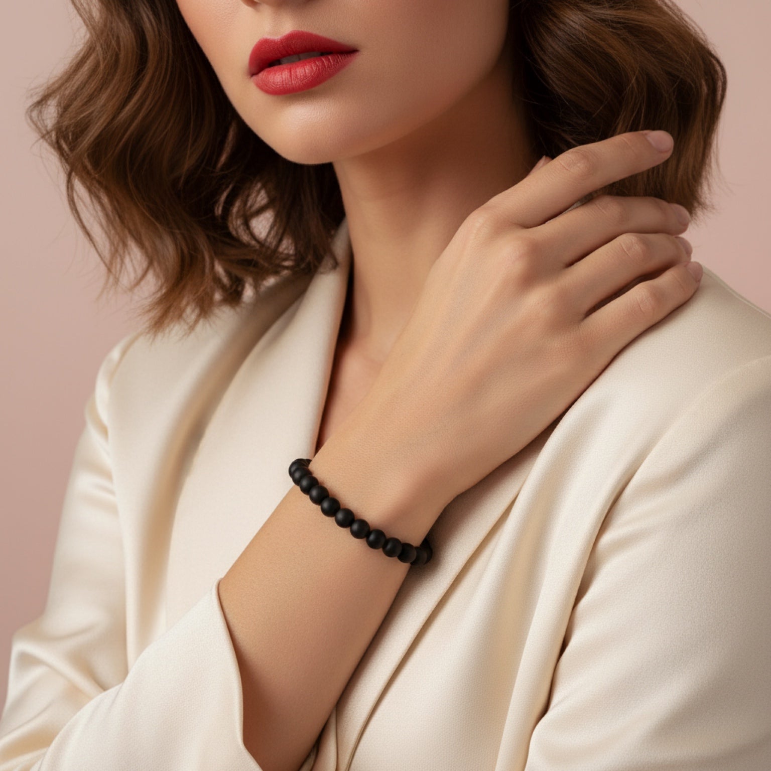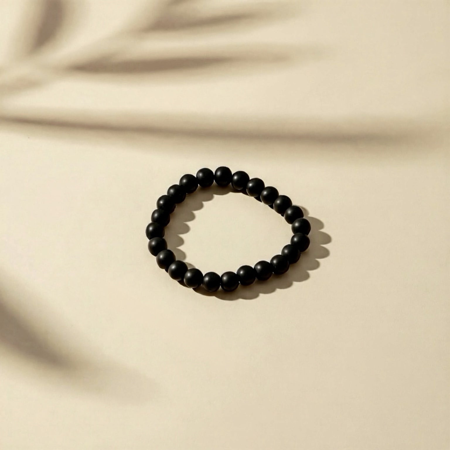 Obsidia is crafted from matte black agate beads, offering a smooth, non-reflective surface. Its minimal design makes it a strong, contemporary piece.