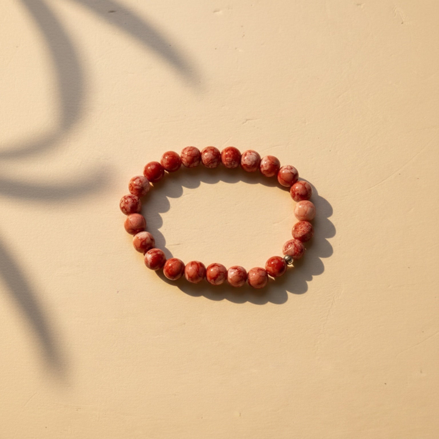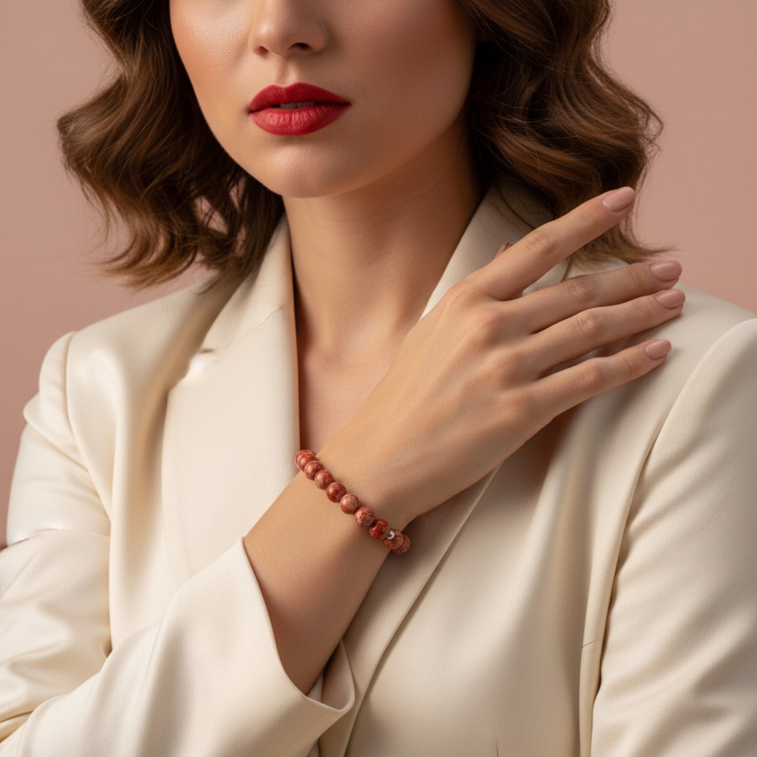 Rubra is crafted from deep red agate beads with natural marbling. The rich tone and smooth surface create a statement piece with a clean, premium aesthetic.