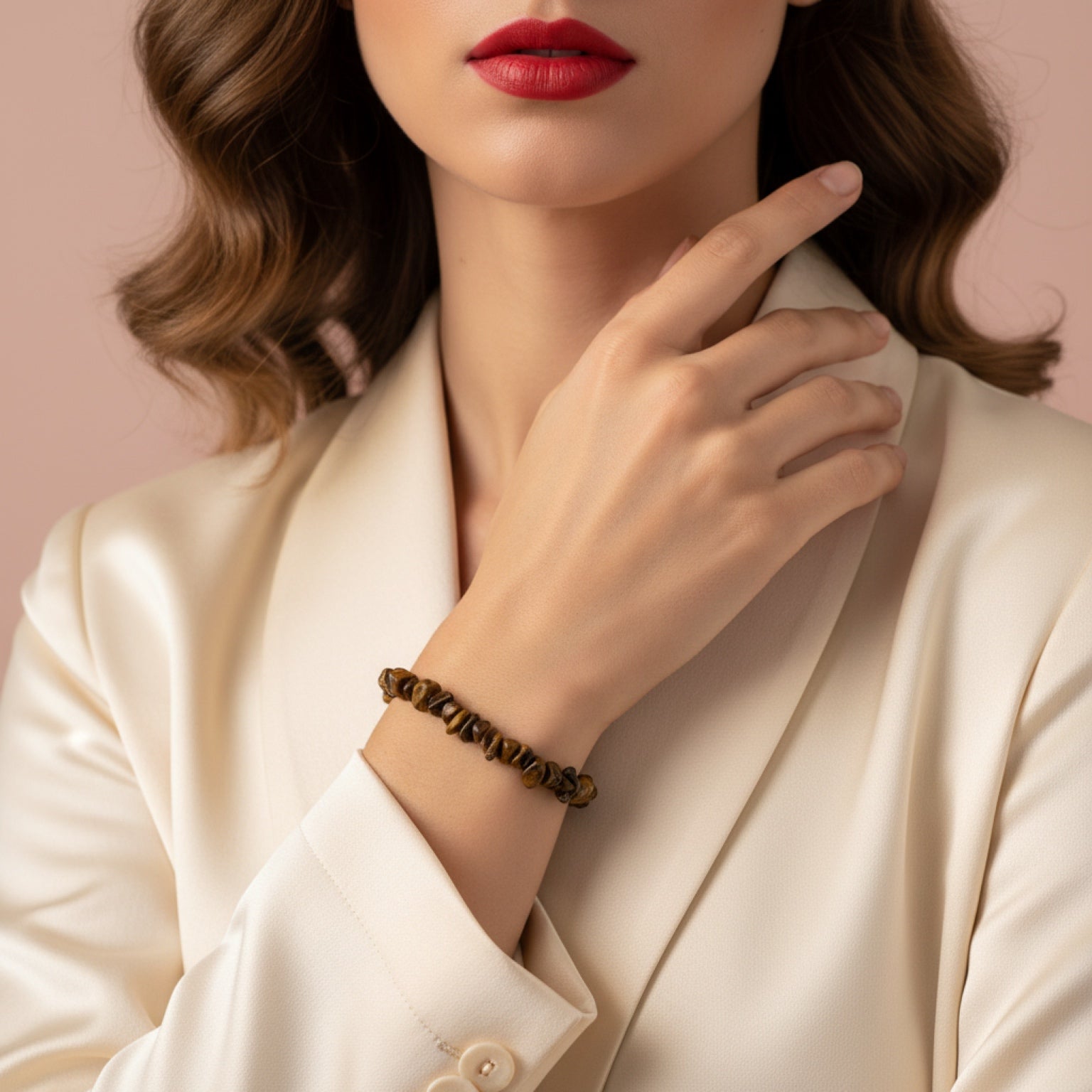 Tiger Eye features irregular polished stone chips in rich golden-brown tones. The natural shapes create a more raw, elevated look compared to standard bead bracelets, giving it a refined artisan finish.
